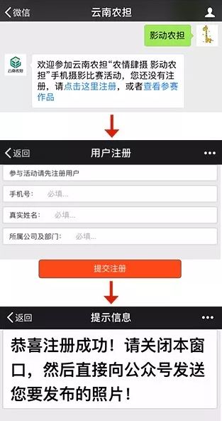 參與方式一:關(guān)注【云南農(nóng)擔(dān)】官方微信號(hào)(在微信公眾號(hào)添加中搜索“云南農(nóng)擔(dān)”或“ynnd2018”即可關(guān)注),在對(duì)話框中輸入“影動(dòng)農(nóng)擔(dān)”四個(gè)字,根據(jù)提示完成信息錄入,在對(duì)話框內(nèi)發(fā)送1張圖片及一句話描述即可。
