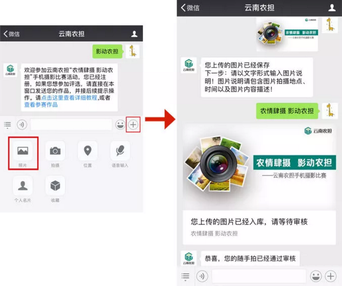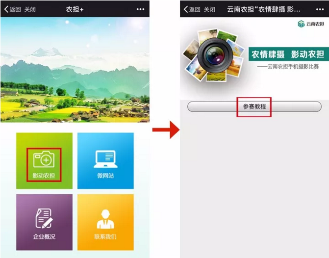 參與方式二:關(guān)注“云南農(nóng)擔(dān)”官方微信號(hào),點(diǎn)擊“農(nóng)擔(dān)+”欄目,選擇“影動(dòng)農(nóng)擔(dān)”進(jìn)入,查看教程后,完成信息錄入,在對(duì)話框內(nèi)發(fā)送1張圖片及一句話描述即可。