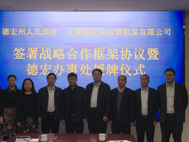 12月19日上午,德宏州人民政府、云南農(nóng)擔(dān)公司簽署戰(zhàn)略合作框架協(xié)議暨德宏辦事處授牌儀式在芒市會堂舉行。德宏州委常委、常務(wù)副州長馬云峰,農(nóng)擔(dān)公司董事長郭影、總經(jīng)理杜開波、機(jī)構(gòu)部負(fù)責(zé)人蔡菲、德宏州財政局、農(nóng)業(yè)局、人行德宏支行、德宏銀監(jiān)分局、農(nóng)行德宏分行、省聯(lián)社德宏辦、各縣市政府等相關(guān)單位參加會議。