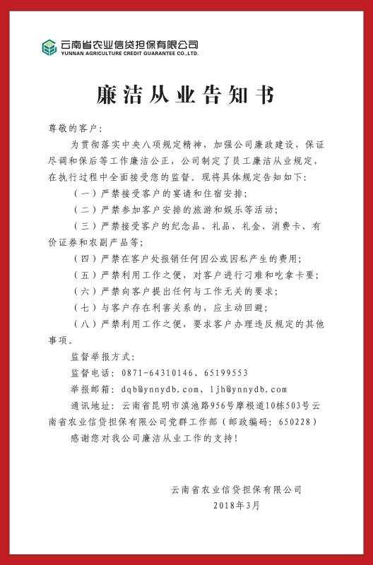 《廉潔從業(yè)告知書》的規(guī)定共有八條,對(duì)業(yè)務(wù)人員在接受客戶宴請(qǐng)和住宿安排,收受客戶的紀(jì)念品、禮品、禮金、消費(fèi)卡、有價(jià)證券和農(nóng)副產(chǎn)品,參加客戶安排的旅游和娛樂活動(dòng),利用工作之便對(duì)客戶進(jìn)行刁難和吃拿卡要,與客戶存在利害關(guān)系應(yīng)主動(dòng)回避等方面都做出嚴(yán)格規(guī)定。告知書末尾留有公司的監(jiān)督電話、舉報(bào)郵箱和通訊地址等信息,以方便客戶進(jìn)行監(jiān)督舉報(bào)和信息反饋。