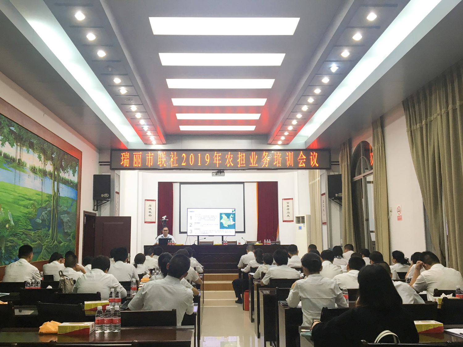 今天的德宏,是我國“一帶一路”的重要國際陸港、面向南亞東南亞輻射中心的關(guān)鍵點(diǎn)、中緬經(jīng)濟(jì)走廊的門戶樞紐。為更好的推動(dòng)自由貿(mào)易試驗(yàn)區(qū)瑞麗市的業(yè)務(wù)開展,深化銀擔(dān)合作,10月29日,德宏辦事處項(xiàng)目經(jīng)理閆忠魁、尹瑞、張雯雯一行赴瑞麗市農(nóng)村信用合作聯(lián)社開展業(yè)務(wù)交流座談會(huì),并受邀進(jìn)行業(yè)務(wù)培訓(xùn)會(huì)。瑞麗市聯(lián)社監(jiān)事長尹金能、副主任郭建材、信貸部經(jīng)理施婷及市內(nèi)各網(wǎng)點(diǎn)主任及信貸經(jīng)理共40人參會(huì)。